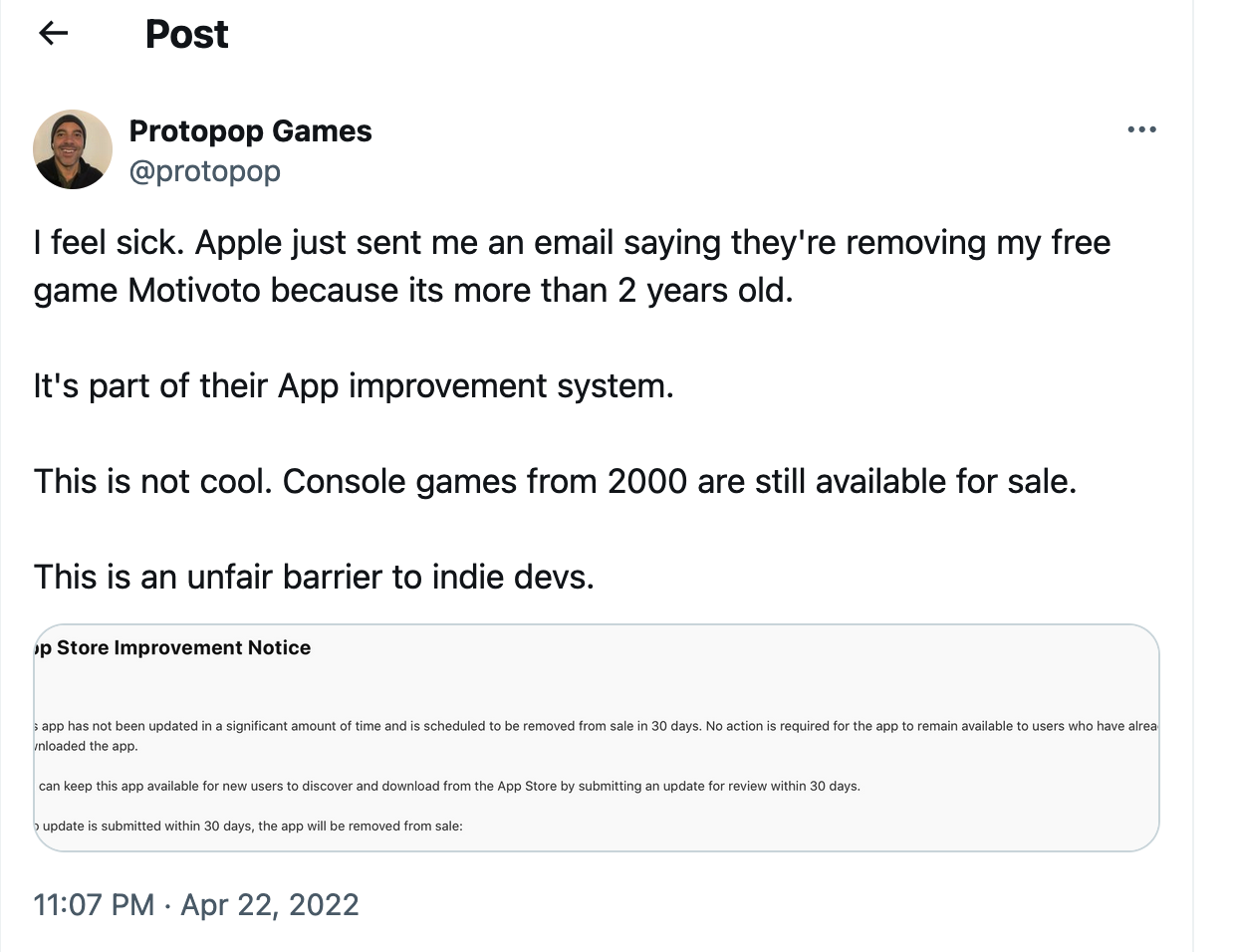 First, programmers think that “two years,” is “old.” The madness of this statement should be apparent to anybody who’s not a toddler, but Node.js considers three years “long-term” and Apple erases apps after age two3 and Google does much the same.4